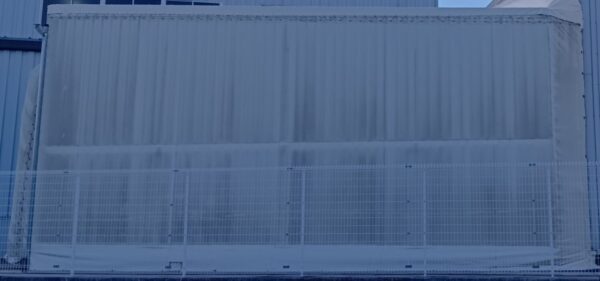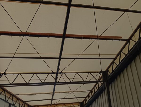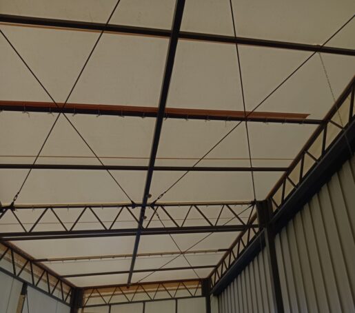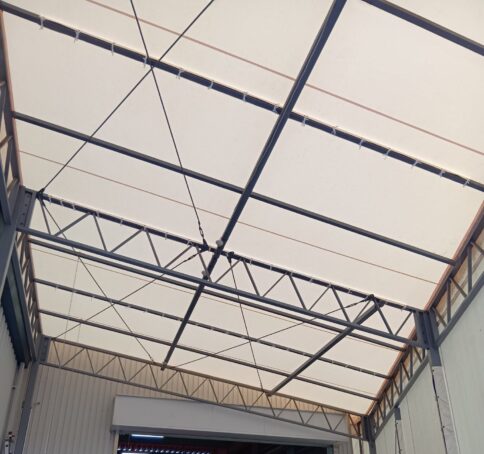 テント倉庫屋根面張替工事をさせていただきました。生地:テイジン ハリケーン ライトアイボリー