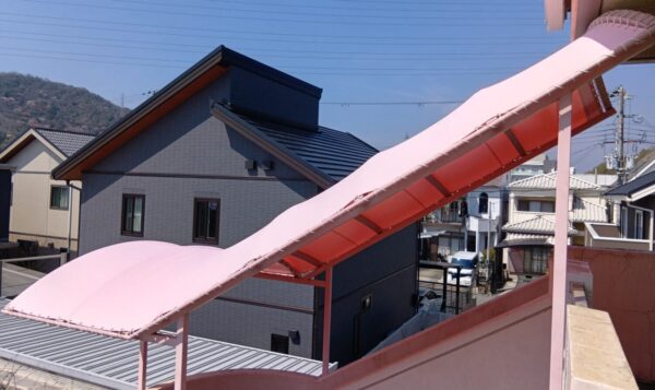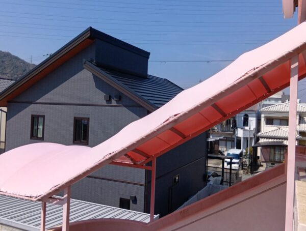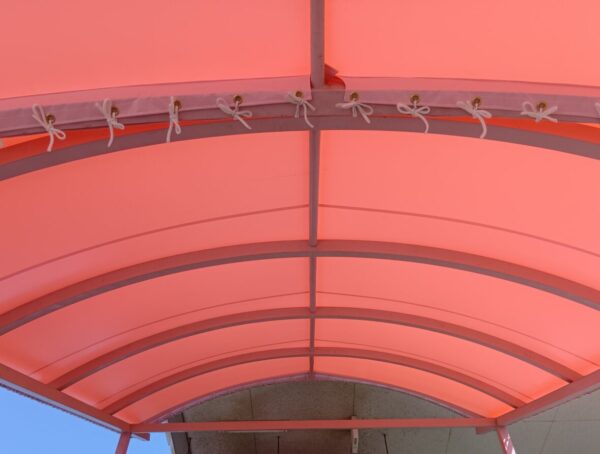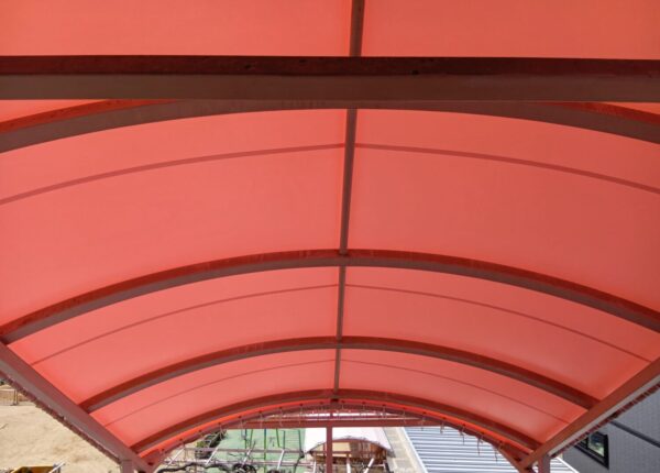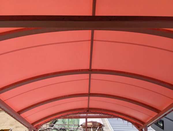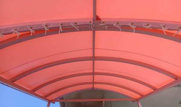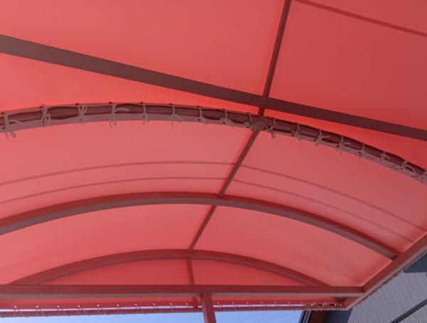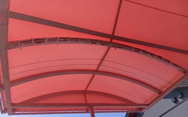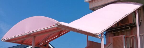 階段テント張替工事をさせていただきました。生地:テイジン ニューパスティ 8896FP ベビーピンク