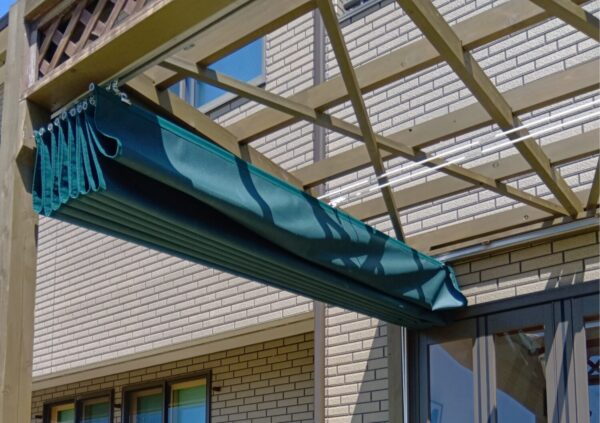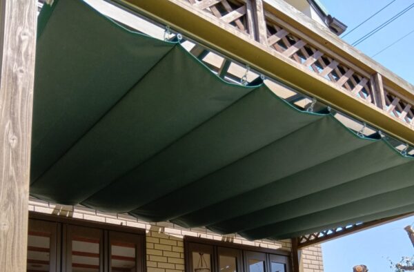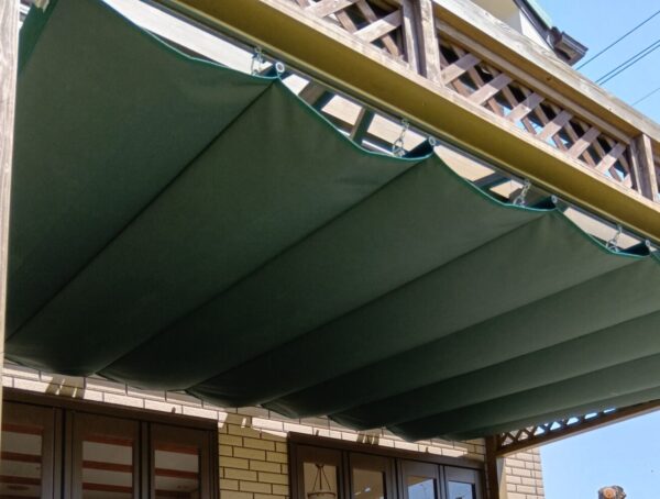 テラスレール開閉式テント張替工事をさせていただきました。生地:テイジン シャガール EC22 フォレストグリーン